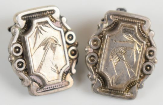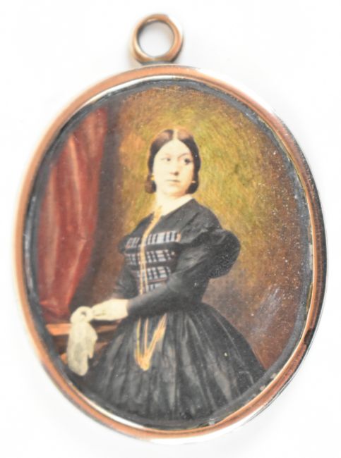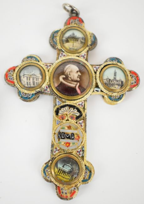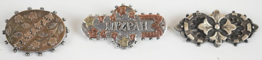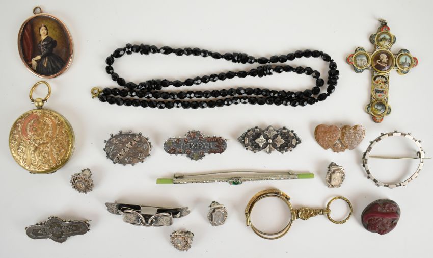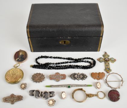 A collection of jewellery including Victorian hallmarked silver brooch with floral decoration (Chester 1887), two white metal Victorian brooches, Victorian hallmarked silver brooch (Birmingham 1889), two pairs of Victorian white metal earrings, gold plated Victorian locket, Victorian locket set with painted plaque of a young woman verso mother of pearl, French jet beaded necklace, Art Deco paste brooch, silver brooch set with a cameo (Birmingham 1908), silver Mizpah brooch with applied gold decoration (Birmingham 1896), c1900 cross pendant set with micro mosaic reading 'Roma' and ceramic plaques, etc in tooled leather box