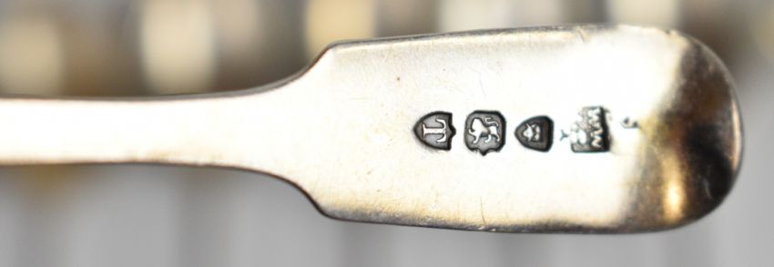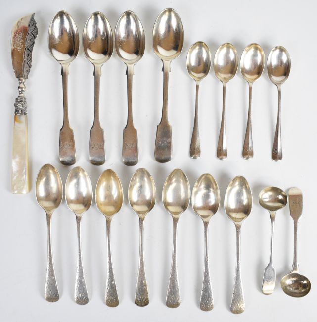 Georgian and later hallmarked silver cutlery to include four rat tail tea or coffee spoons, four fiddle pattern teaspoons, two fiddle pattern salt spoons and a Victorian hallmarked silver and mother of pearl butter knife, length of longest 17.5cm, weight excluding knife 310g