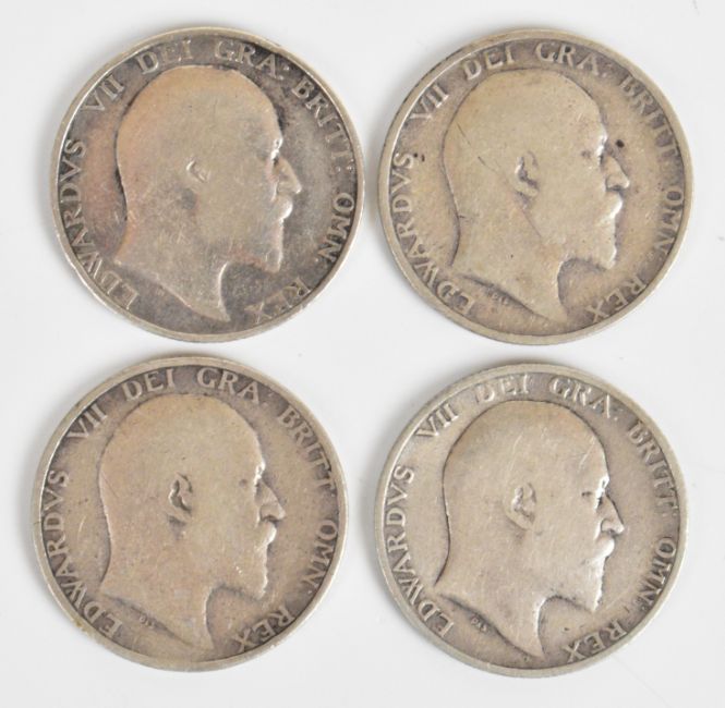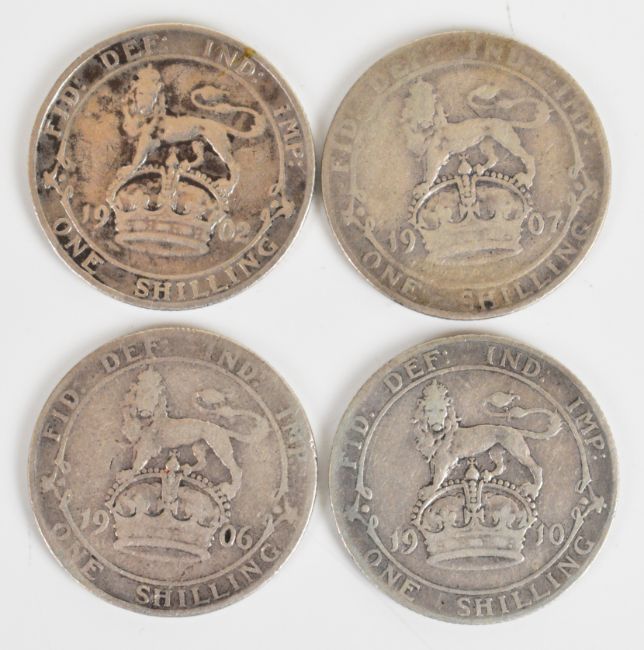 Four Edward VII shillings comprising 1902, 1906, 1907 and 1910, weight 22g