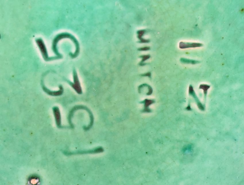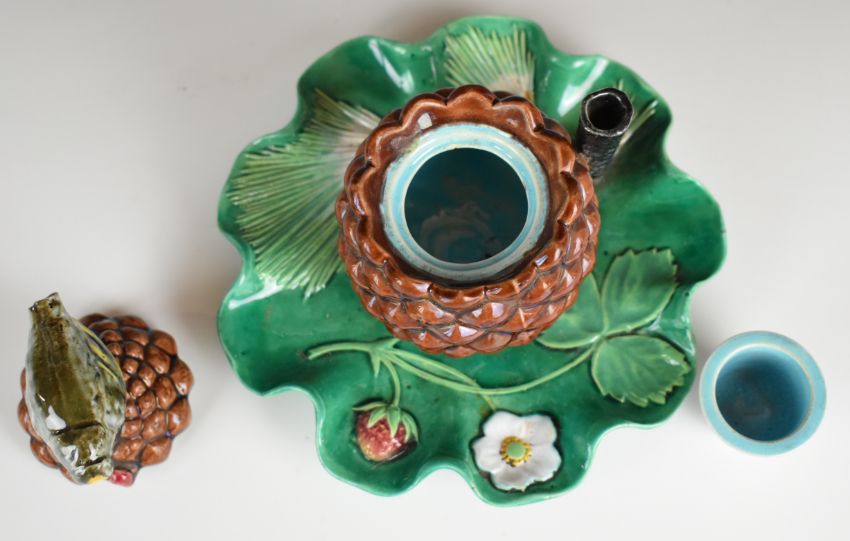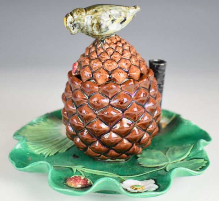 19thC Minton majolica pine cone inkwell / Standish with figural bird cover, impressed Minton 1525 to base, H14cm