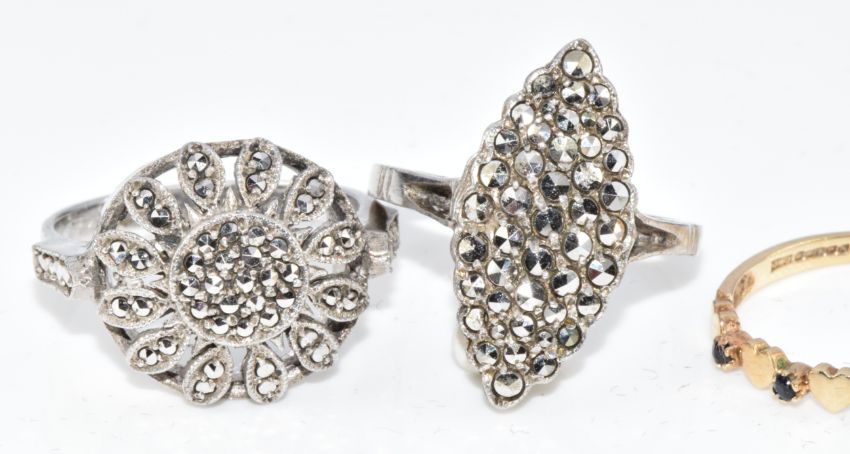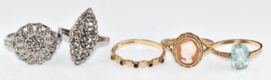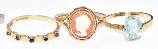 Three 9ct gold rings including paste, cameo and sapphire (5.8g, size L, N & O) and two silver rings set with marcasite