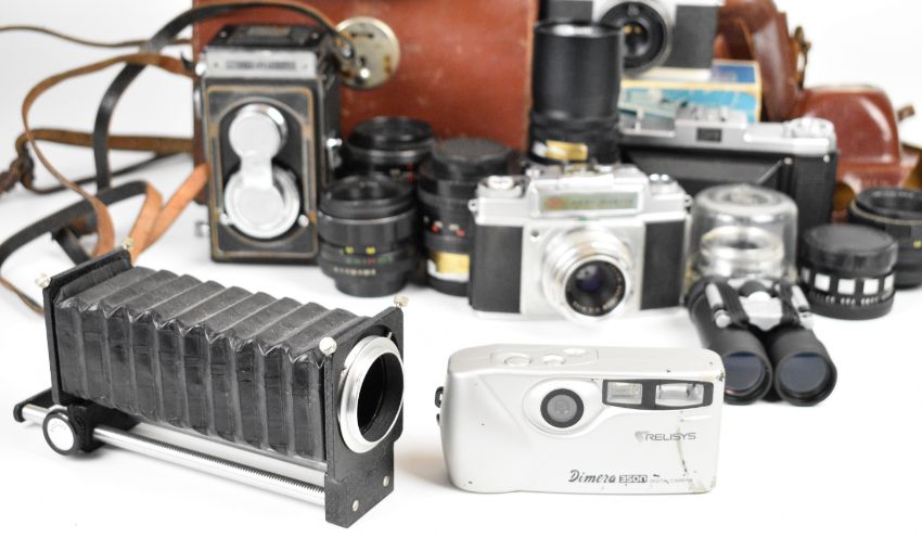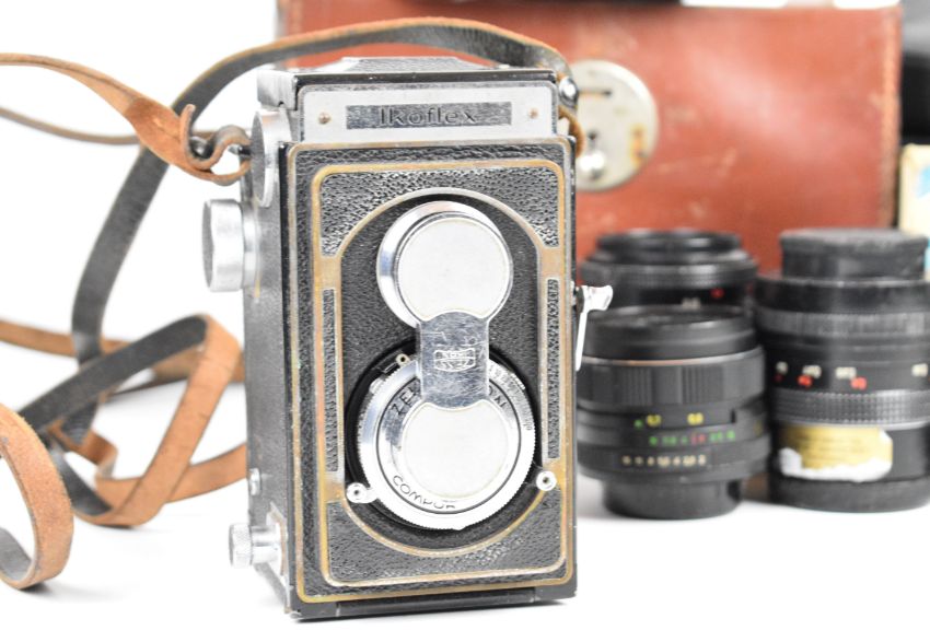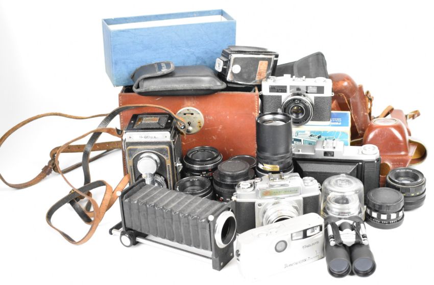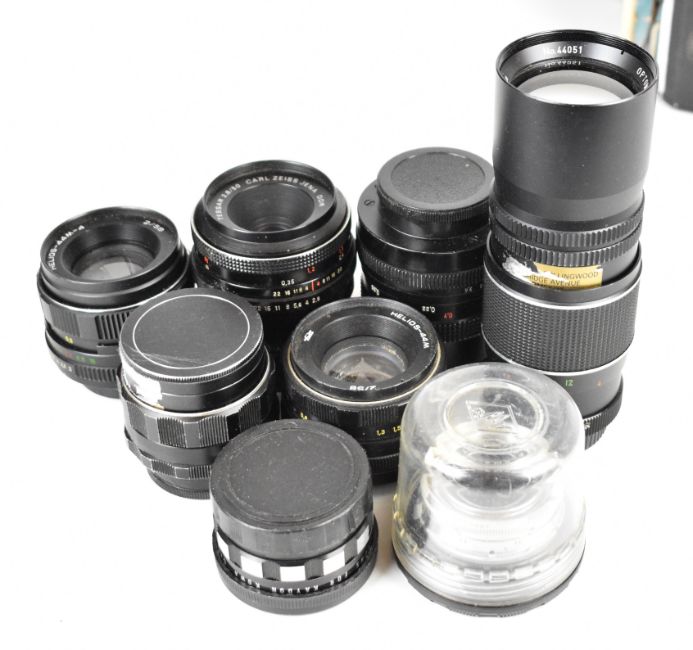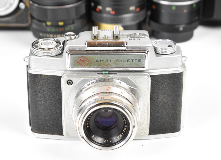 Collectable cameras and lenses to include Ikoflex TLR, Zeiss Ikon 518/2 folding camera, Agfa Ambi Silette with 1:2/50 and 1:4/35 lenses, Carl Zeiss MC Flektogon 2.4/35 and Tessar 2.8/50, Super-Takumar 1:1.8/55, Optomax 1:4.5 f=200mm and two Helios 2/58 lenses