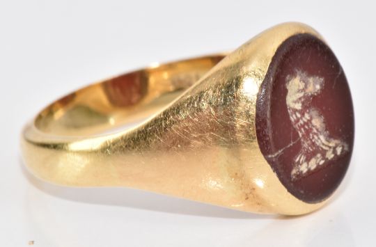 An 18ct gold signet ring set with an agate intaglio seal depicting a dog, 4.1g, size J