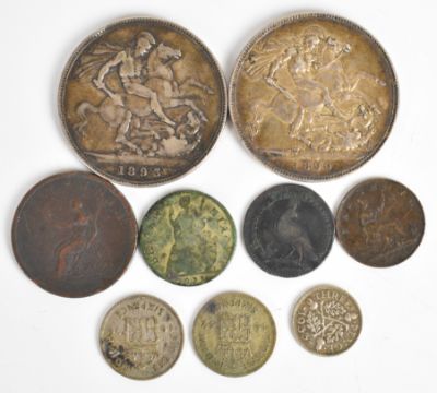 Georgian and later British coinage to include 1890 and 1893 crowns, 1807 halfpenny, 1895 farthing and a Pidcock's Exhibition token