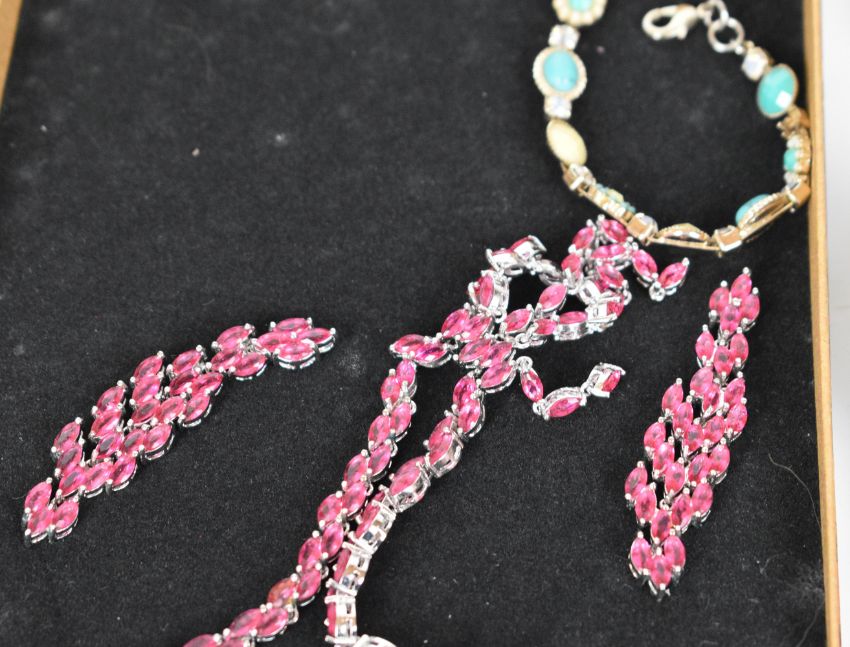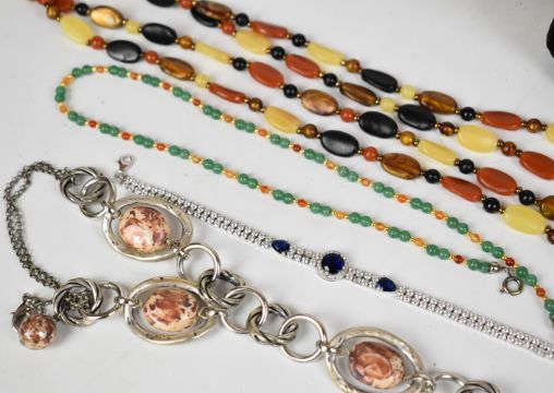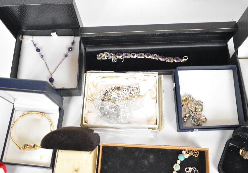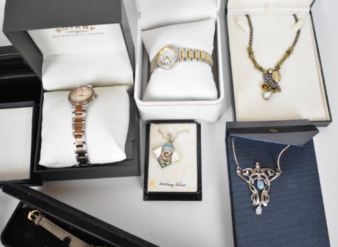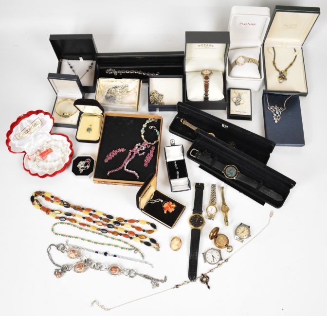 A collection of jewellery including silver necklace set with a synthetic opal, Pulsar watch in original box, silver brooch, silver necklace set with opals and garnets, silver pendant set with mother of pearl and abalone, silver necklace set with amethysts, Rotary watch in original box, silver bracelet set with amethysts, silver bracelet set with peridot, two Pierre Cardin watches set with opal, silver earrings, etc
