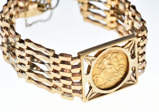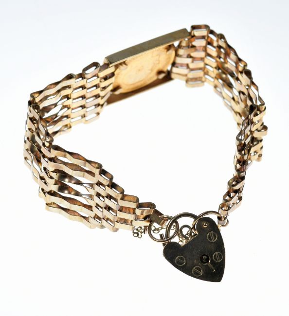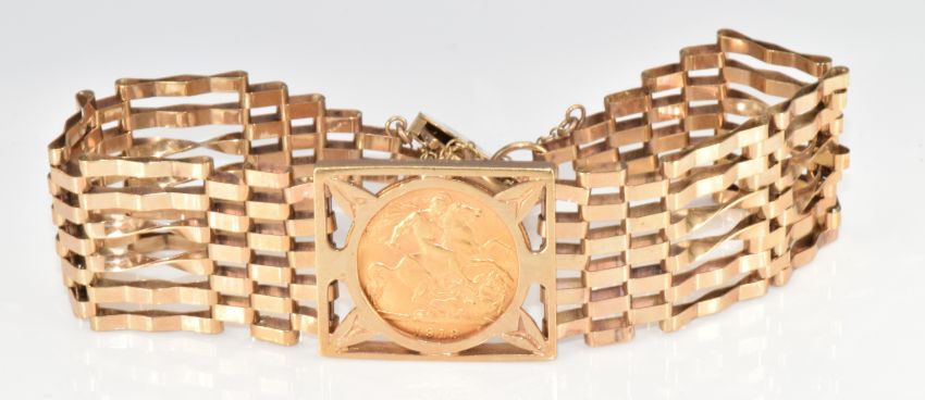 A 9ct gold gate bracelet set with a 1913 gold half sovereign and with heart padlock clasp, 20g