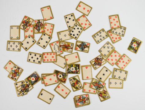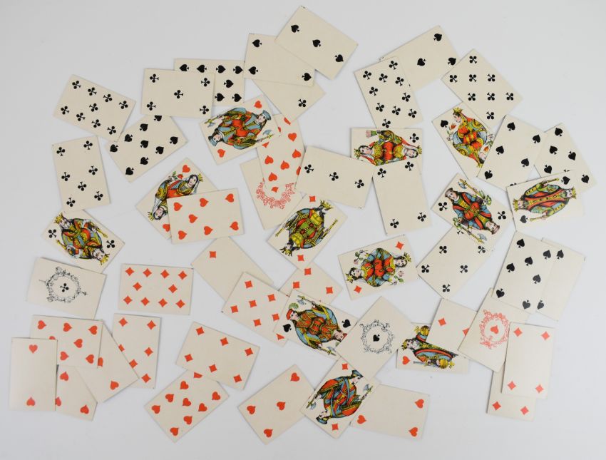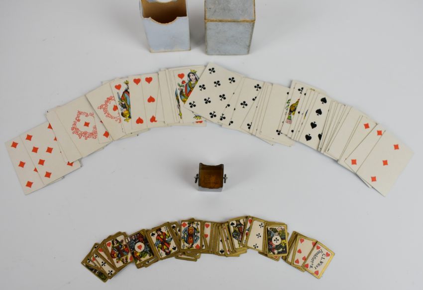 C L Wüst, Frankfurt pack of fifty two miniature playing cards in white metal container with ring handles, 1.8 x 1.4cm, and a 19thC continental miniature pack in cardboard case 52/52, 3.5 x 2.8cm