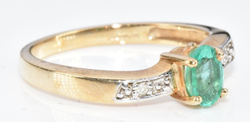 A 9ct gold ring set with an oval cut emerald and diamonds, 2.4g, size N