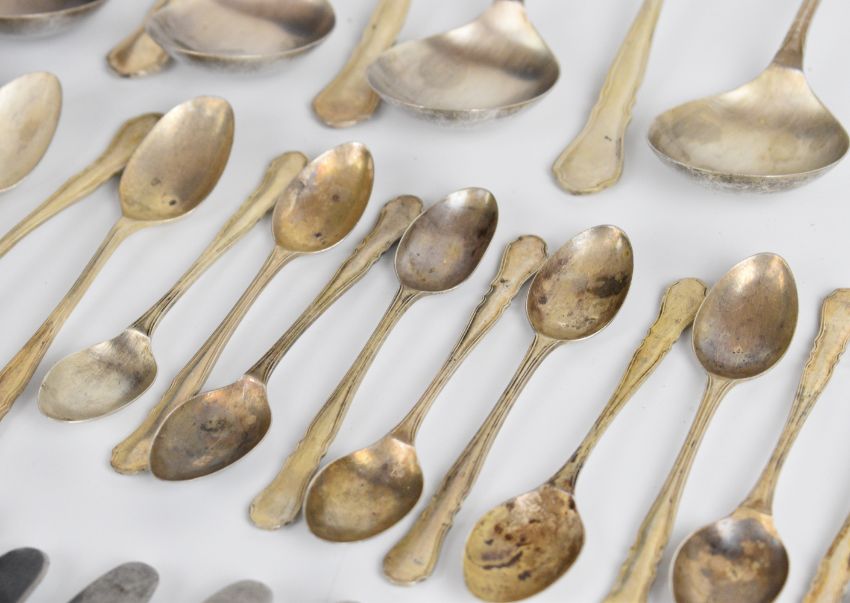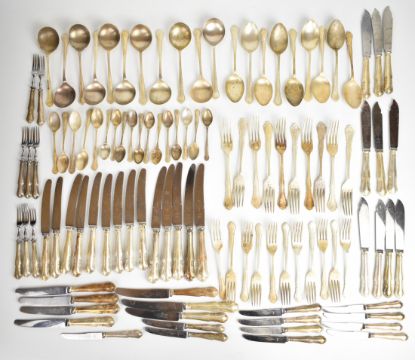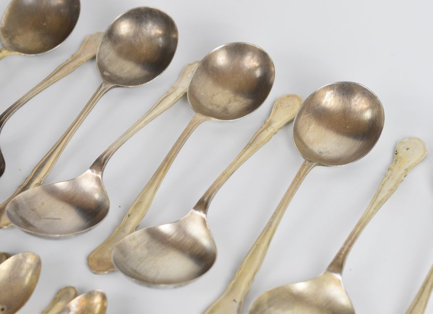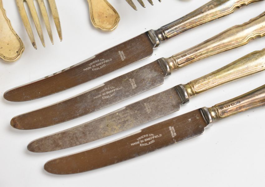 Elizabeth II Viner's Ltd canteen of hallmarked silver cutlery comprising 10 dinner forks, 11 dessert forks, 11 soup spoons, 9 dessert spoons, 5 teaspoons, 12 coffee spoons, 6 dinner knives, 6 smaller knives, 9 similar length knives, 10 fish knives, 8 cake forks and 11 cake knives, all items Sheffield 1961/62, length of longest knives 25cm weight of solid silver items 2477g
