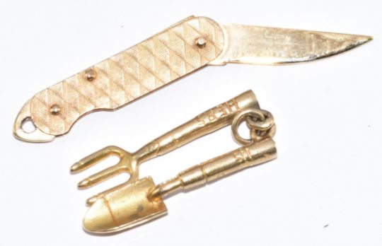 A 9ct gold charm / pendant in the form of a miniature penknife and a 9ct gold charm in the form of a trowel and fork, 4.7g, 2.5cm