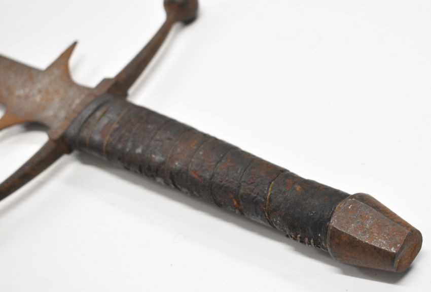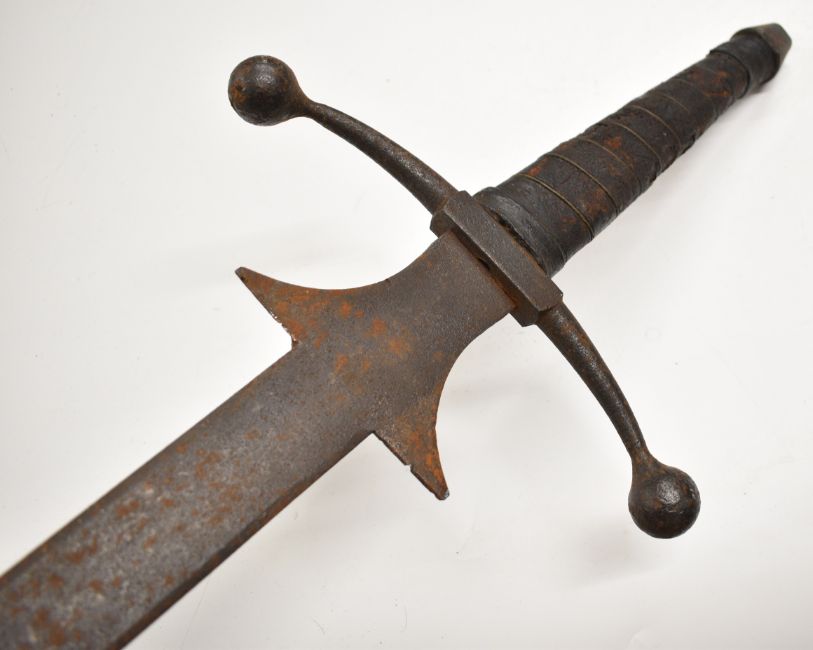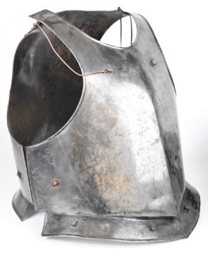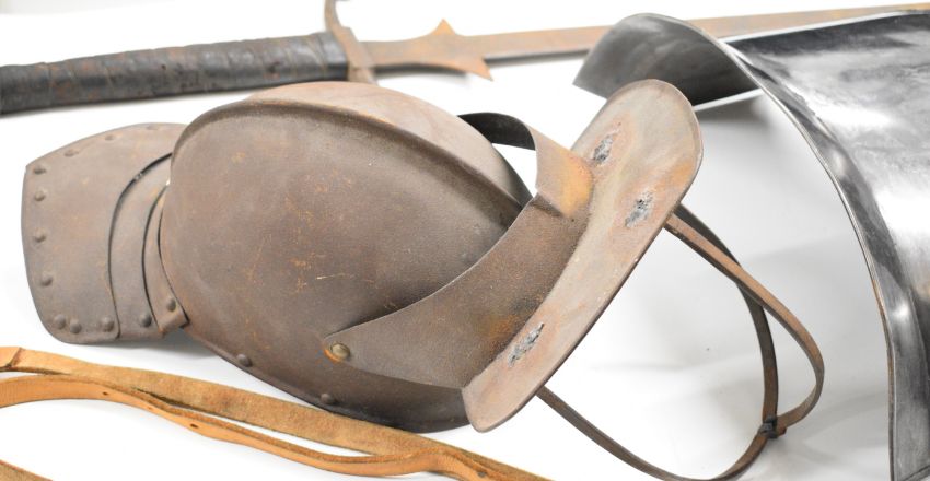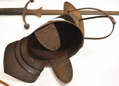 Replica 17thC armour, helmet and broadsword suitable for re-enactment, the sword possibly 19thC or older, overall length 127cm. PLEASE NOTE: WE ARE NOT ABLE TO OFFER OUR USUAL POSTAGE SERVICE FOR THIS LOT