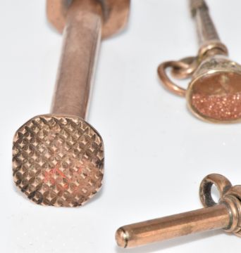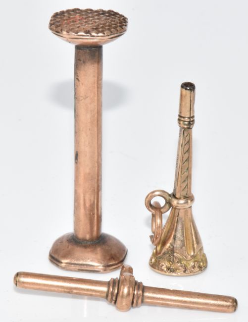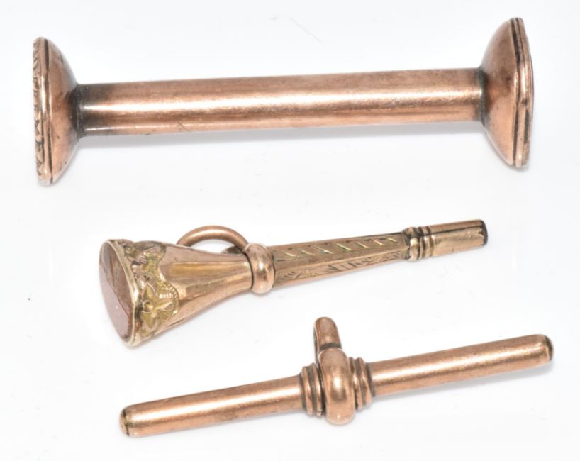 A 9ct gold T bar (2.5g), intaglio seal depicting a table (tests as 9k), and a Victorian watch key