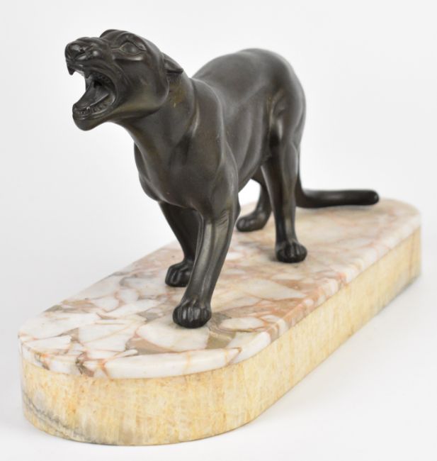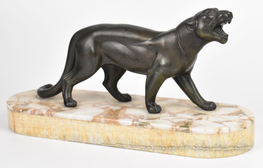 Bronze panther / tiger raised on an oval marble base, H19 x L29cm