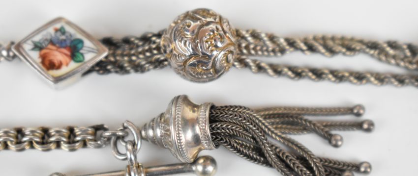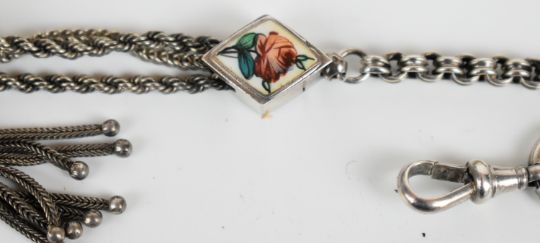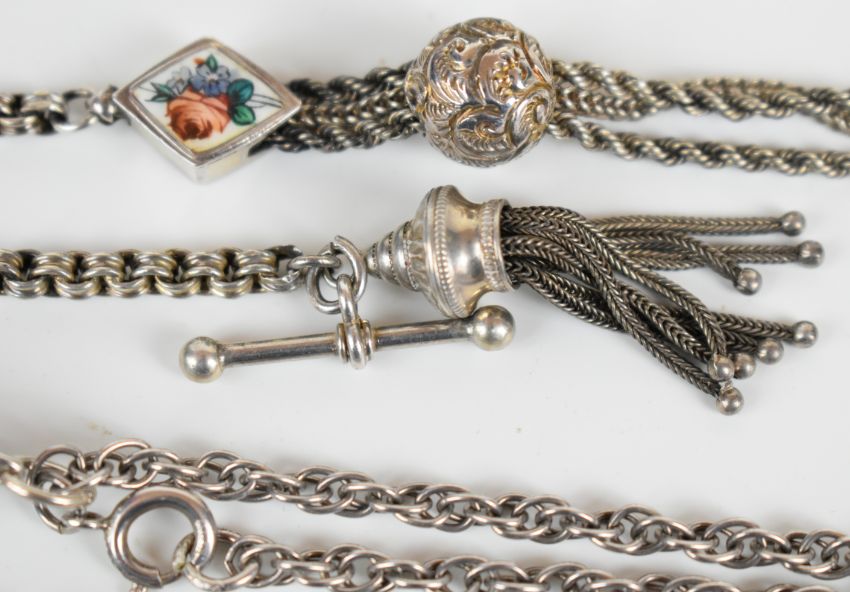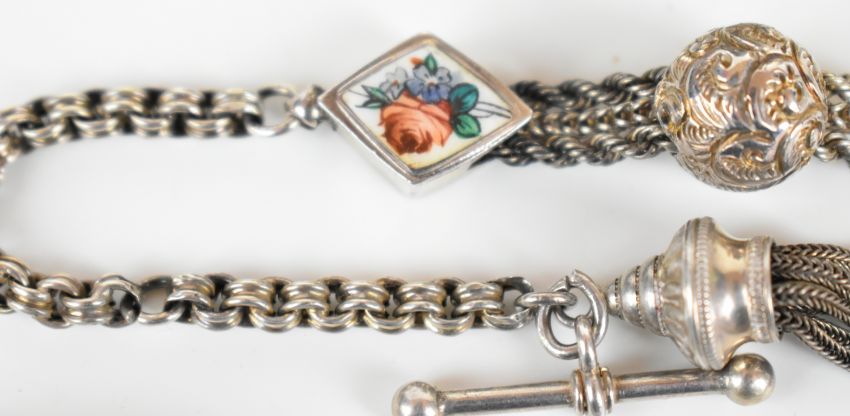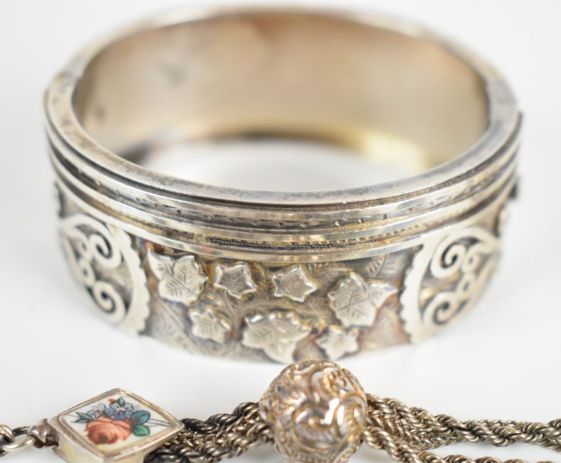 Victorian hallmarked silver bangle with embossed foliate and scrolling decoration, Birmingham 1883, Victorian silver Albertina with sliding ball and enamelled inserts and a silver propelling pencil, maker D & S, Birmingham 1888