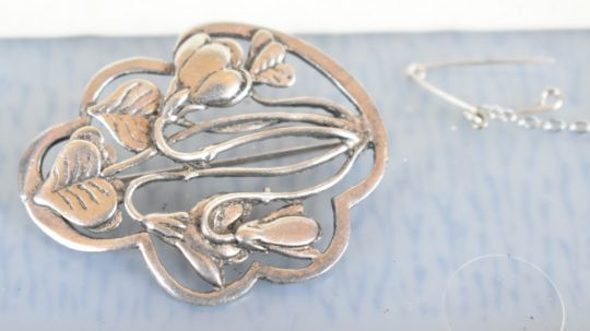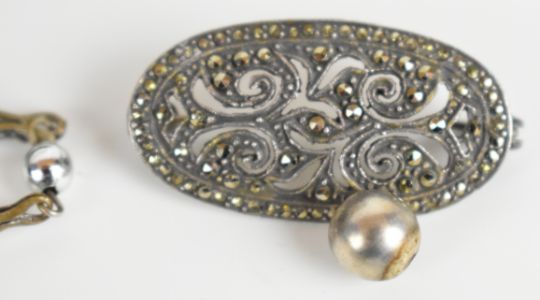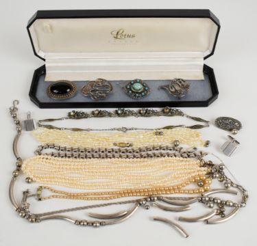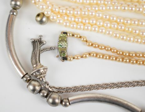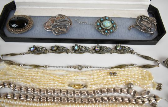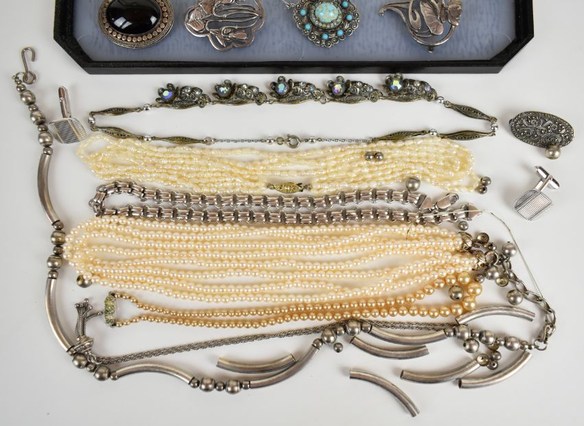 A collection of silver jewellery including two brooches, tassel charm, necklaces, 130g together with freshwater pearl necklace, brooches, etc