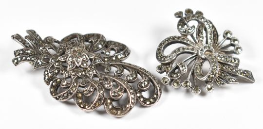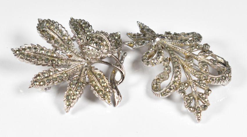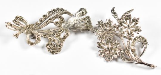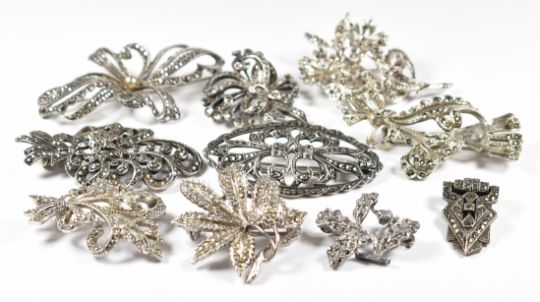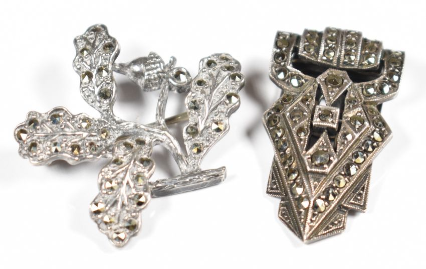 Five silver brooches and a silver clip, all set with marcasite (67g), two Exquisite brooches set with marcasite and two other marcasite set brooches