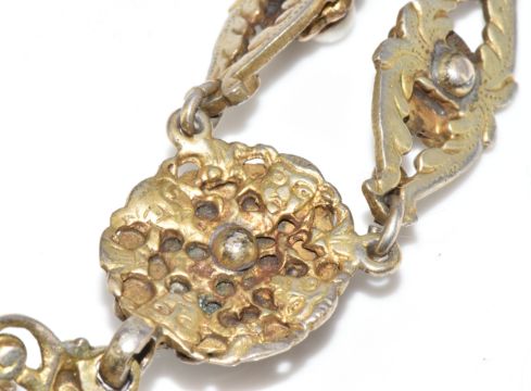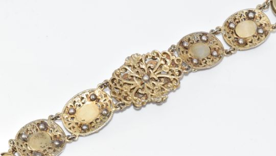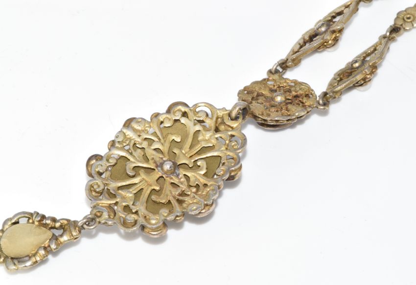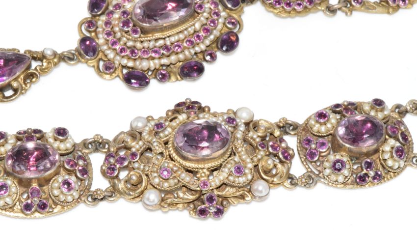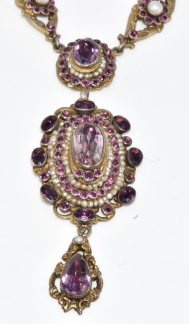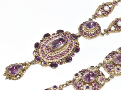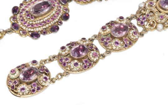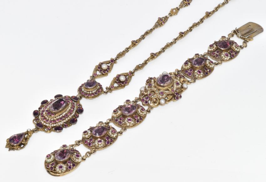 Austro-Hungarian silver gilt bracelet and necklace set with split pearls, seed pearls, paste and foiled amethysts, marked for 800 grade silver and the town of Pest, 77.9g, 18.2cm & 37cm