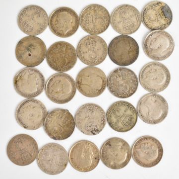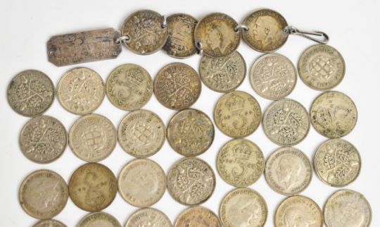 Silver 3d coins comprising approximately 34g of pre-1920 and approximately 62.5g of pre-1947