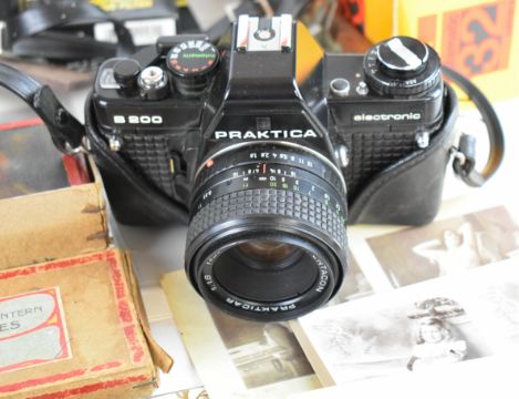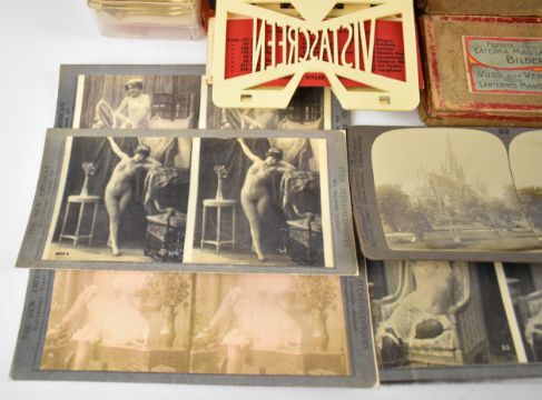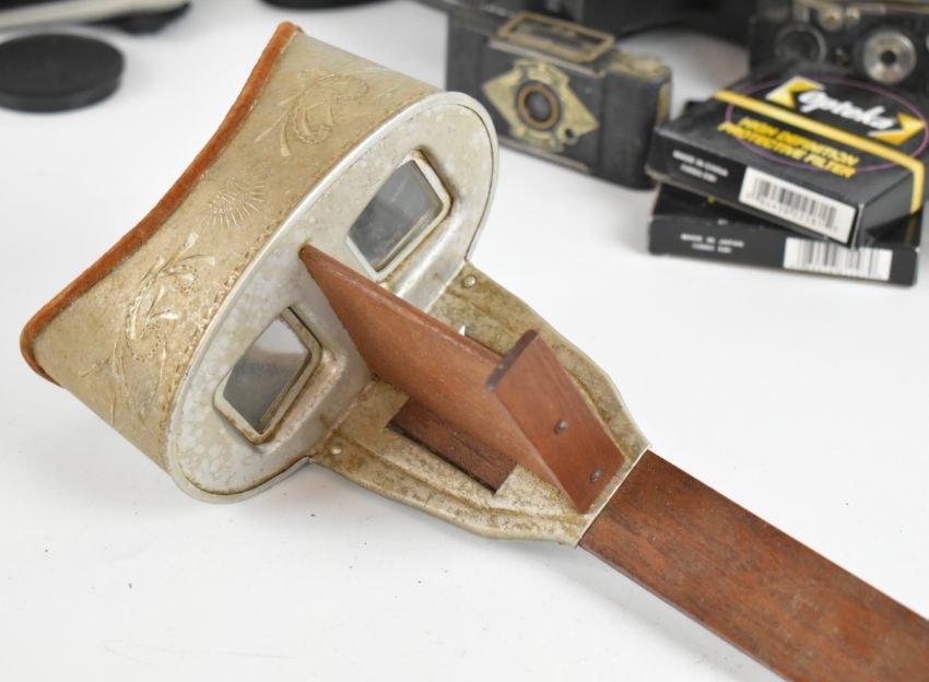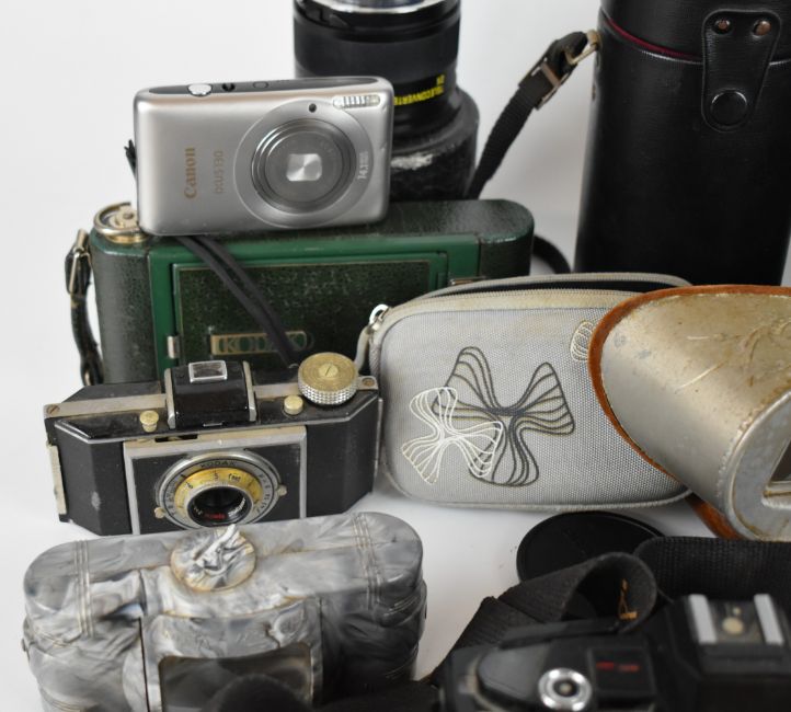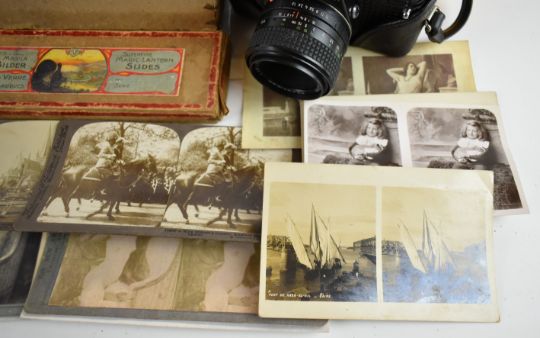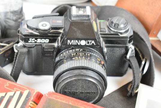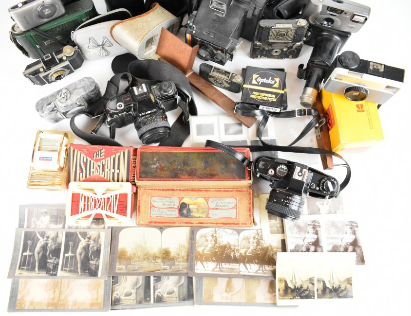 Collectable cameras to include Minolta X-300 35mm SLR with 50mm 1:1.7, Tamron 1:3.8 80-210mm, and Mitakon 1:2.8 f-28mm lenses, Praktica B200 with Pentacon 1:1.8 f=50mm lens, Ensign Midget folding camera, green folding Kodak No 1 pocket camera, Kodak Instamatic 32 in original box, stereoscopic viewer and cards including reproduction glamour examples and a boxed set of Bing magic lantern slides