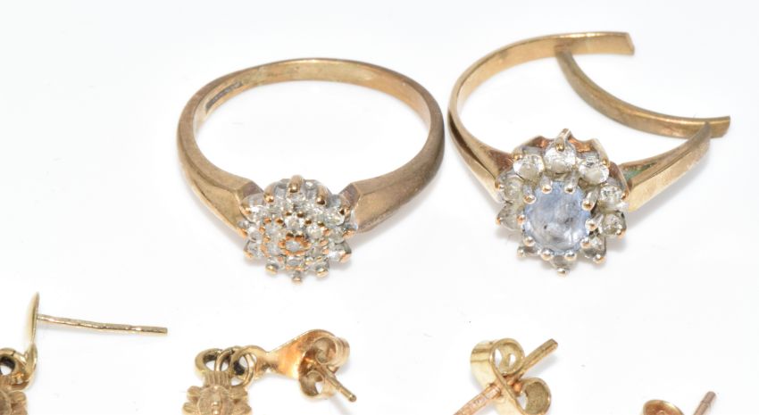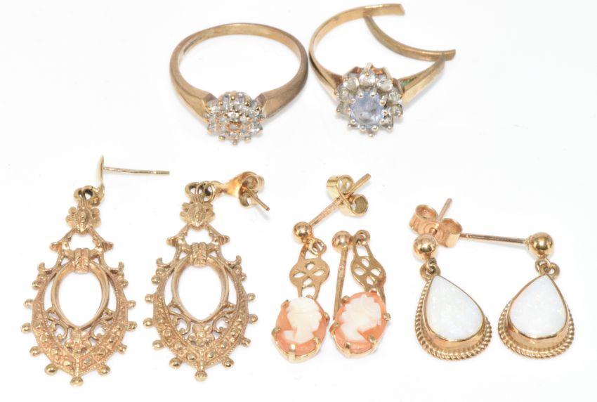 Three pairs of 9ct gold earrings comprising opal set, cameo and floral design and two 9ct gold rings (band cut and missing), 9.5g
