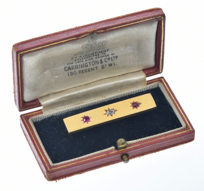 Victorian 15ct gold brooch set with an old cut diamond, a spinel and replacement paste in star settings, in antique 'Carrington & Co' box, 3.3g, 4cm