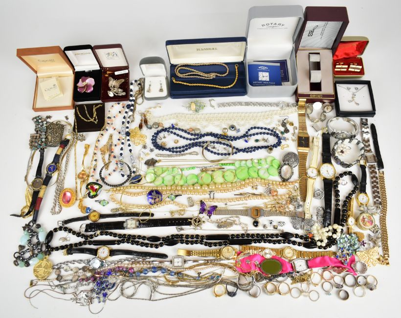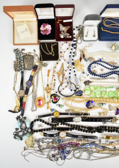 A collection of jewellery including silver bracelet set with mother of pearl, watches, silver earrings set with paste, 9ct gold cased watch, silver items including locket on chain, earrings, rope twist necklace, bracelet, Scottish brooch (18.4g), bangle (13.7g), two brooches, 9ct rose gold ring (1.6g), nine silver rings (29g), Clogau silver necklace in original box, four pairs of 9ct gold earrings (2.2g), five single 9ct gold earrings (1.6g), a 14k gold ankh pendant (0.8g), etc