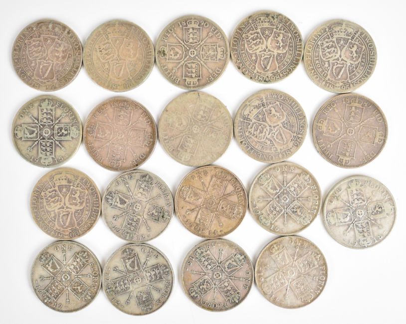 Approximately 215g pre 1920 British silver coinage comprising 19 Queen Victoria and George V florins