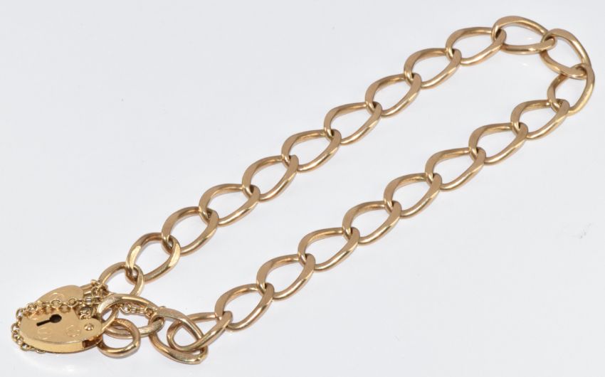 A 9ct gold curb link bracelet with heart padlock clasp, 10.1g, 18cm