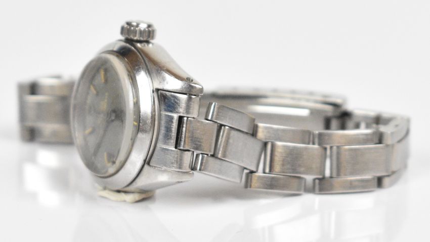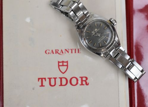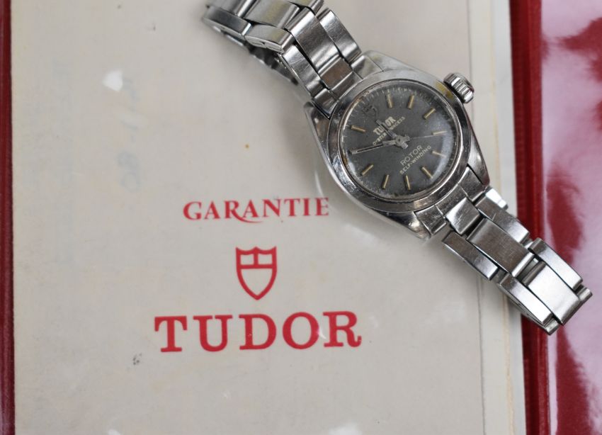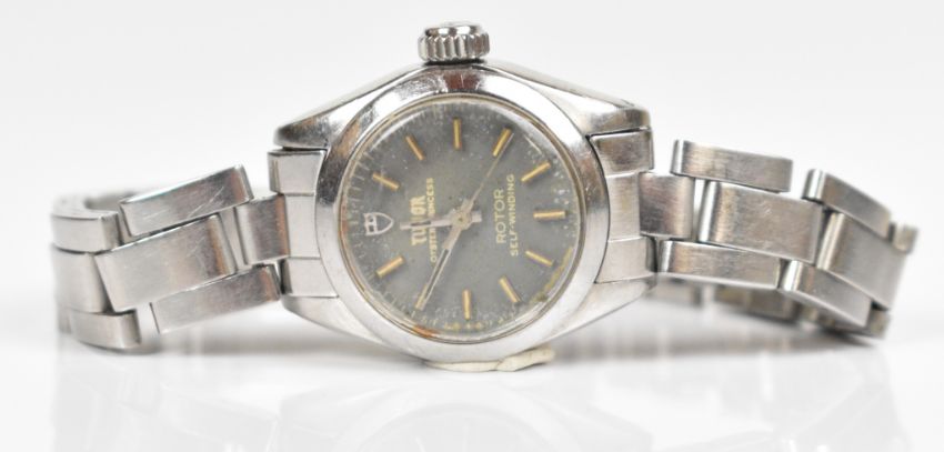 Tudor Oyster Princess Rotor ladies wristwatch with steel hands and hour markers, grey dial and stainless steel case marked to the back 'Original Oyster case by Rolex Geneva', on stainless steel bracelet, case diameter 23mm, in original box with guarantee, purchase receipt and spare bracelet links.