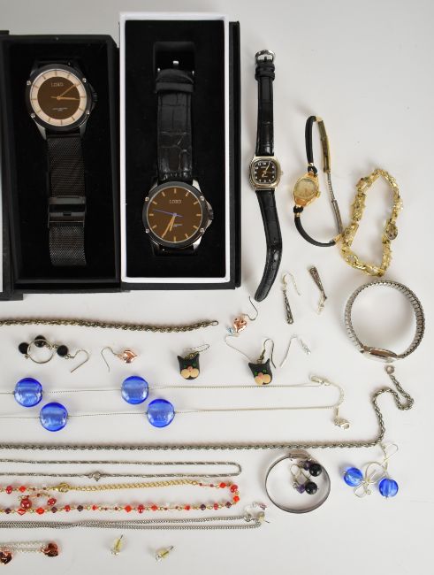 A collection of jewellery including silver christening bangle, silver rope twist bracelet, four pairs of silver earrings, amethyst earrings and pendant, lapis lazuli earrings and pendant, 9ct gold watch, costume jewellery, three Lord watches all new in box etc