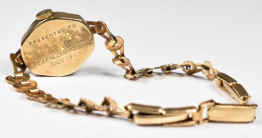 Rotary 9ct gold ladies wristwatch with gold hands and hour markers, silver dial and 15 jewel movement, on 9ct gold bracelet, case diameter 16mm, 11.4g.