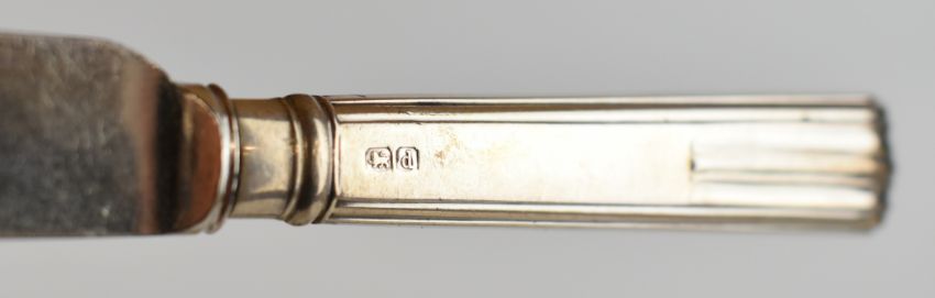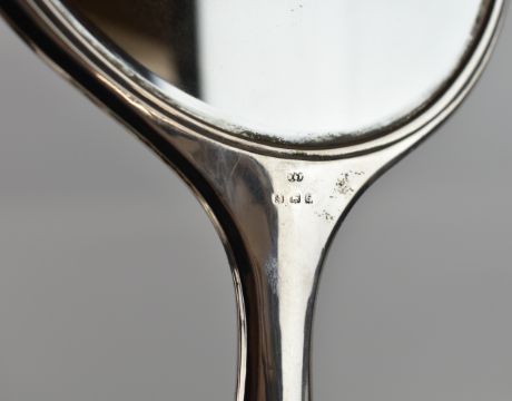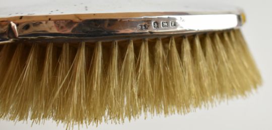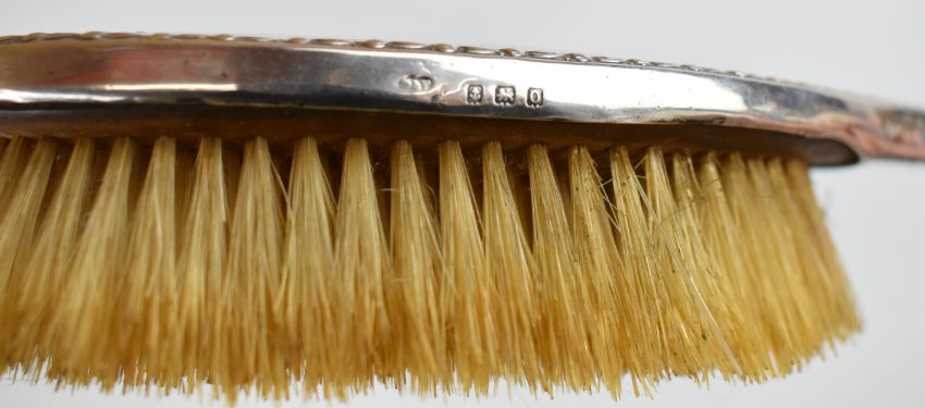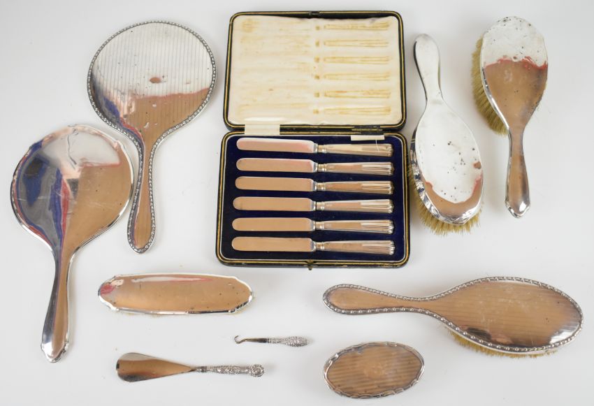 Hallmarked silver handled and backed items comprising set of butter knives, hand mirror, hand mirror back, five various brushes, shoe horn and a button hook, length of longest 28cm