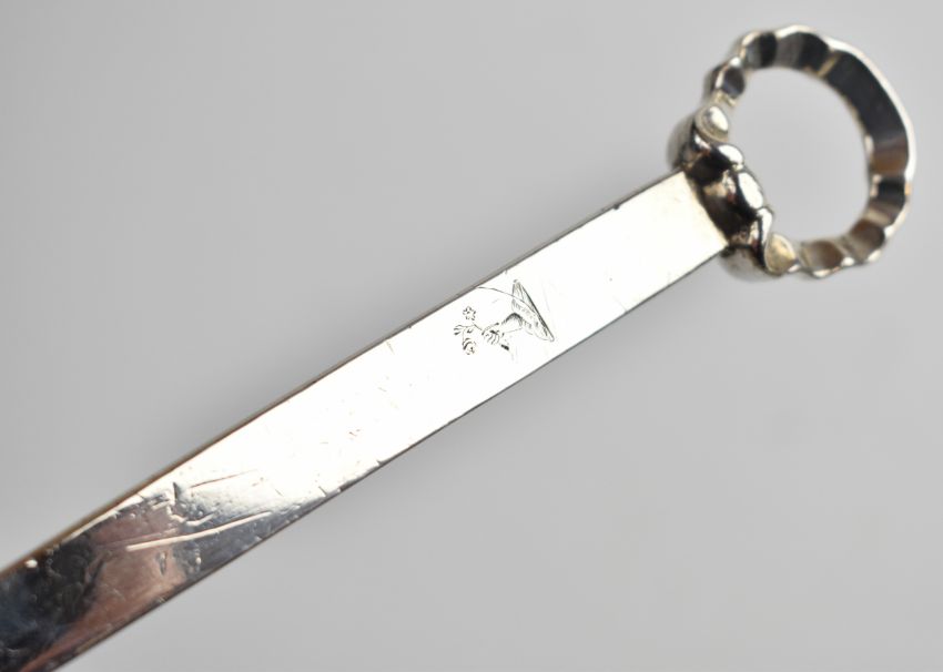 Georgian hallmarked silver meat skewer with loop handle formed as a ribbon, London 1766, maker's mark indistinct but likely John Payne, length 29cm, weight 89g