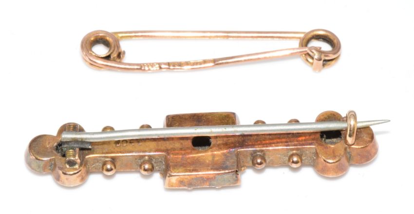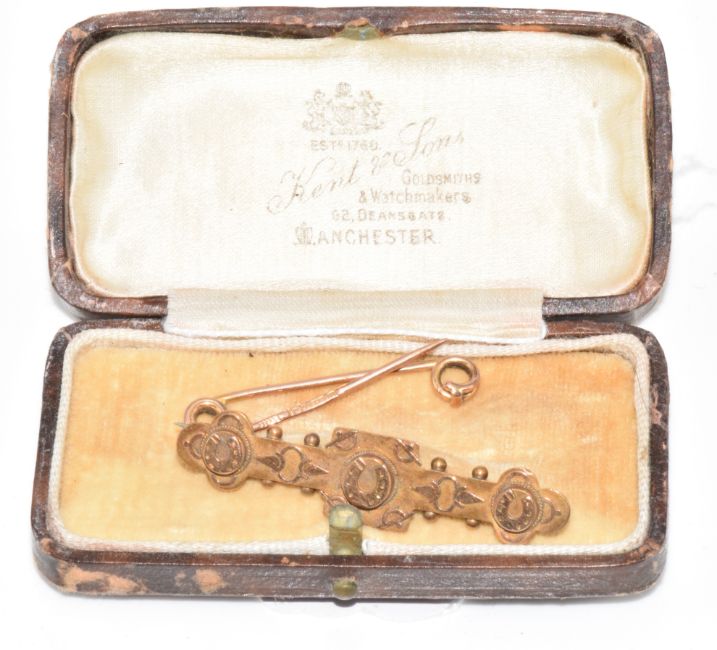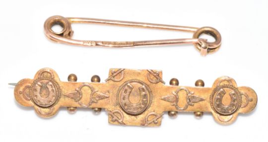 Edwardian 15ct gold brooch with embossed horseshoe decoration (3.2g, 4.5cm) and a 9ct gold brooch/ safety pin (1.3g, 3.4cm, Chester 1917) in antique box