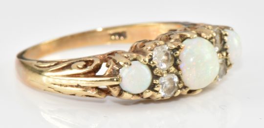 A 9ct gold ring set with three opals and cubic zirconia, 3g, size O