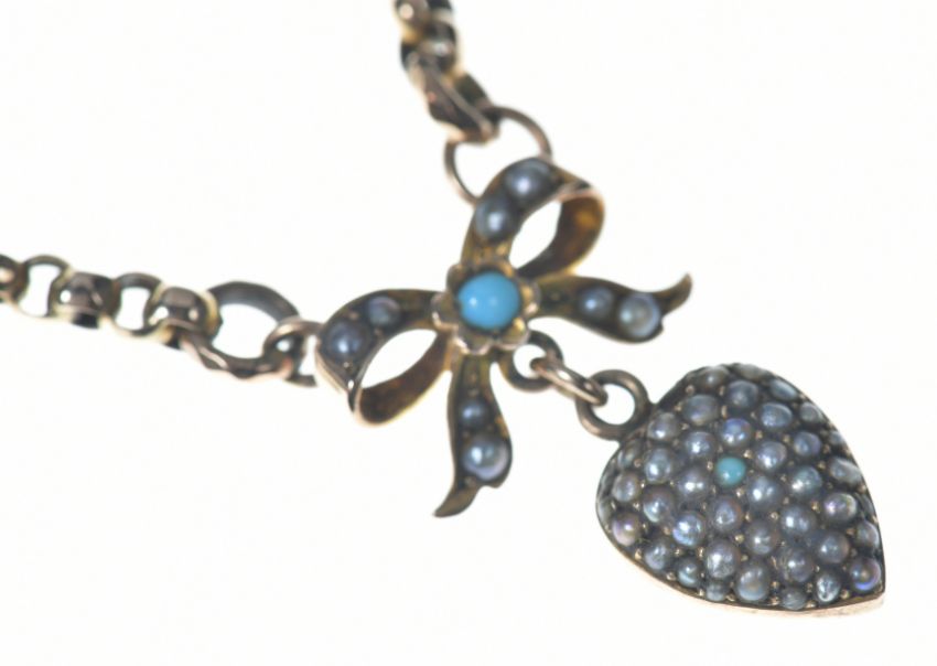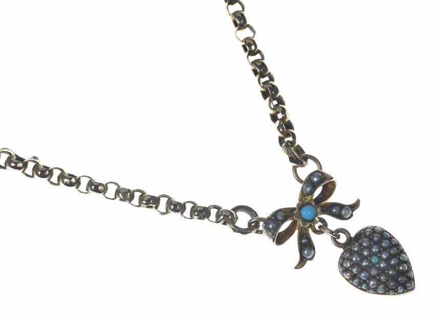 Edwardian 9ct rose gold necklace with bow and heart pendant set with turquoise and split pearls, 12.1g, 43cm (one split pearl missing)