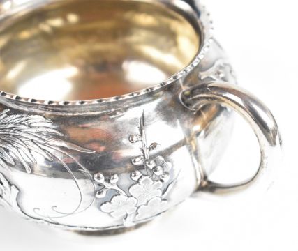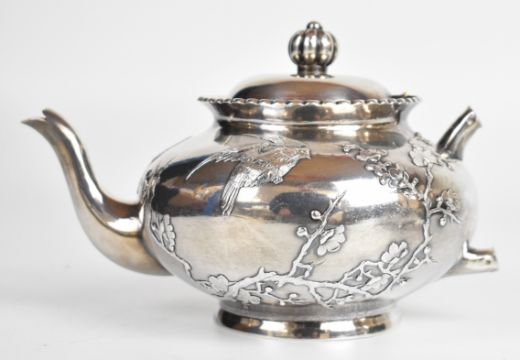 Wang Hing Chinese silver three piece teaset with embossed decoration of birds amongst foliage, each with Chinese 90 silver marks to bases, length of teapot 18.5cm, weight of all three pieces 825g