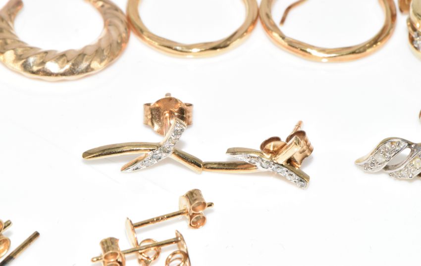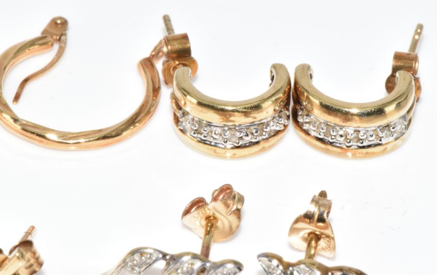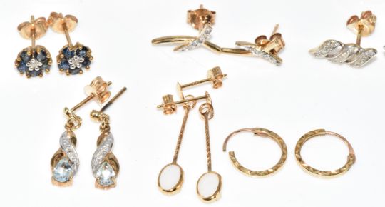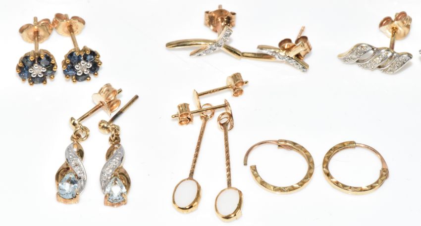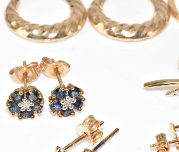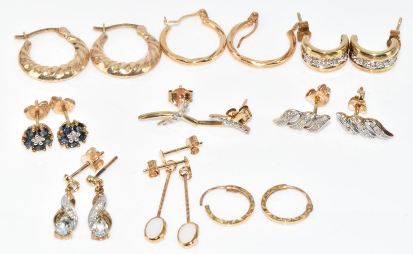 Nine pairs of 9ct gold earrings including diamonds, sapphire and diamond, hoops, etc, 8.1g