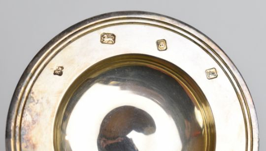 Elizabeth II feature hallmarked Armada dish, London 1985, maker William Comyns & Sons Ltd, diameter 8.5cm weight 45g, in Mallory & Son Bath box