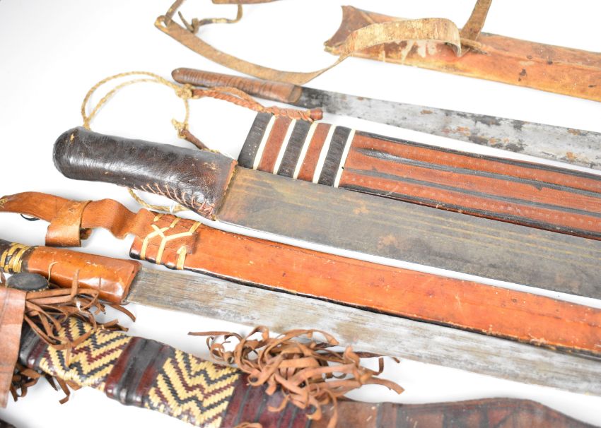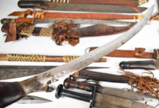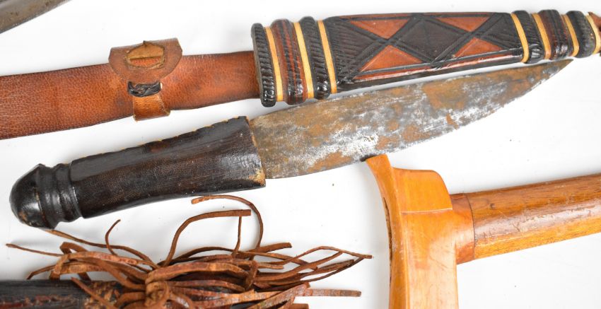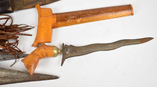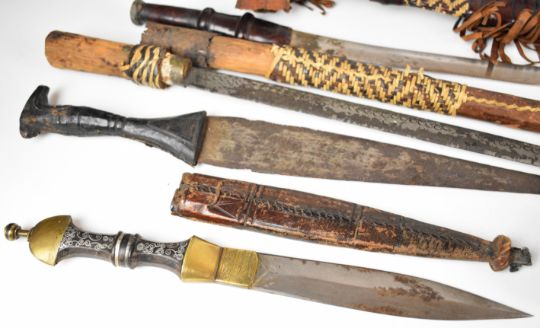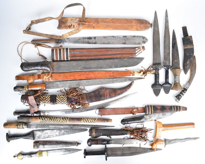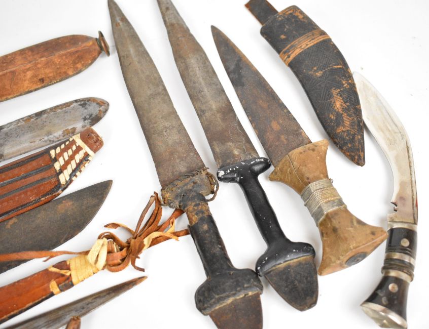 Fourteen mainly North African tribal knives / short swords including a silver wire bound dagger, possibly Sudanese etc, longest 50cm. PLEASE NOTE: WE ARE NOT ABLE TO OFFER OUR USUAL POSTAGE SERVICE FOR THIS LOT