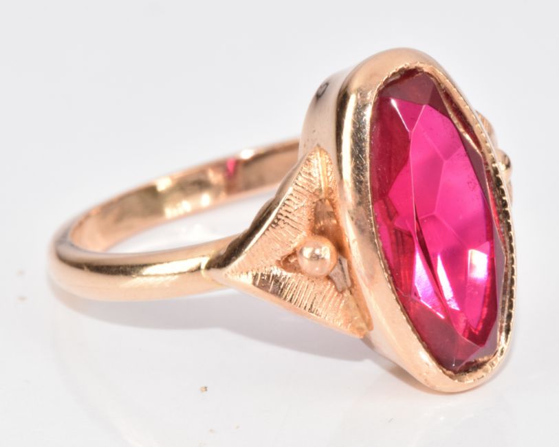 A 333 gold ring set with an oval synthetic ruby, 5.1g, size O