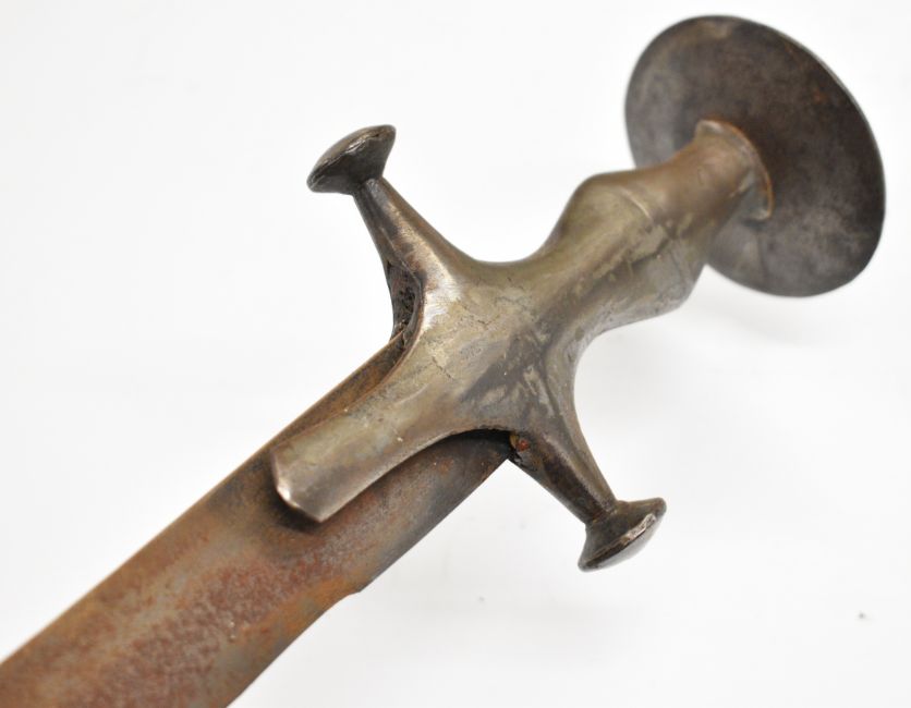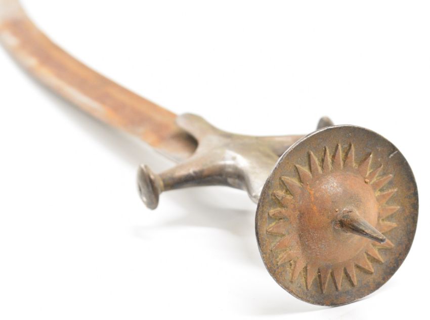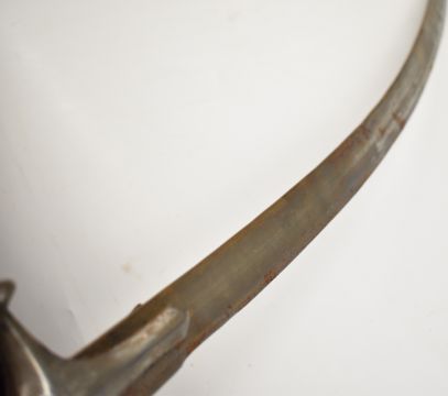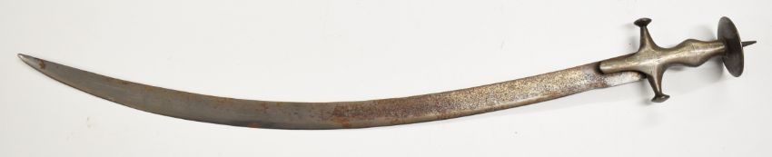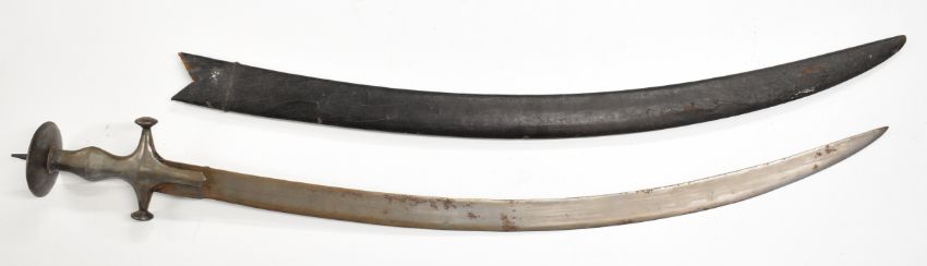Indian Talwar sword in tooled leather scabbard, length 90cm. PLEASE NOTE: WE ARE NOT ABLE TO OFFER OUR USUAL POSTAGE SERVICE FOR THIS LOT