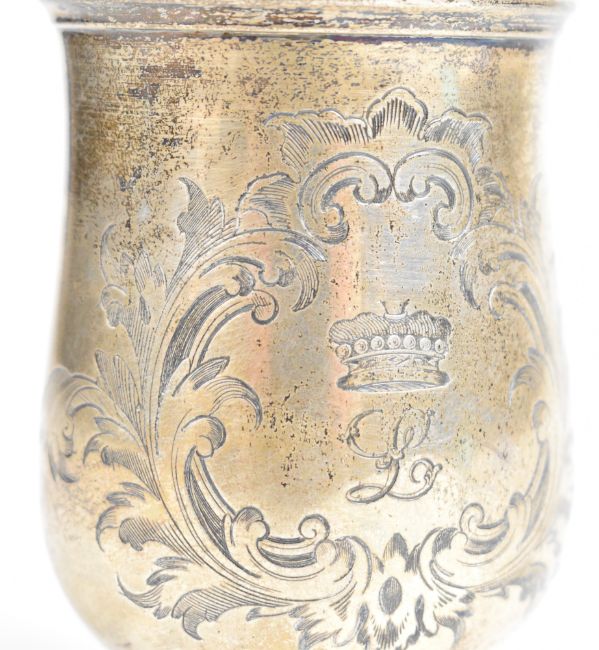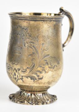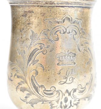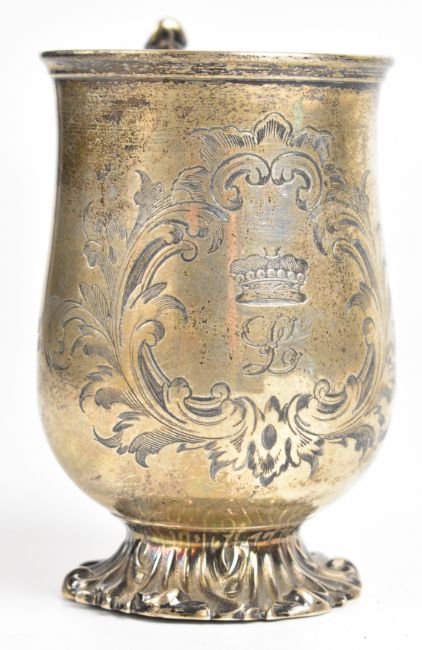 Victorian hallmarked silver christening tankard of baluster form with scroll handle and engraved coronet of a Viscount or Viscountess above a letter L, London 1855, maker Edward & John Barnard, height 11cm, weight 166g