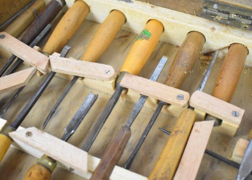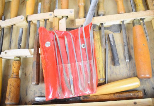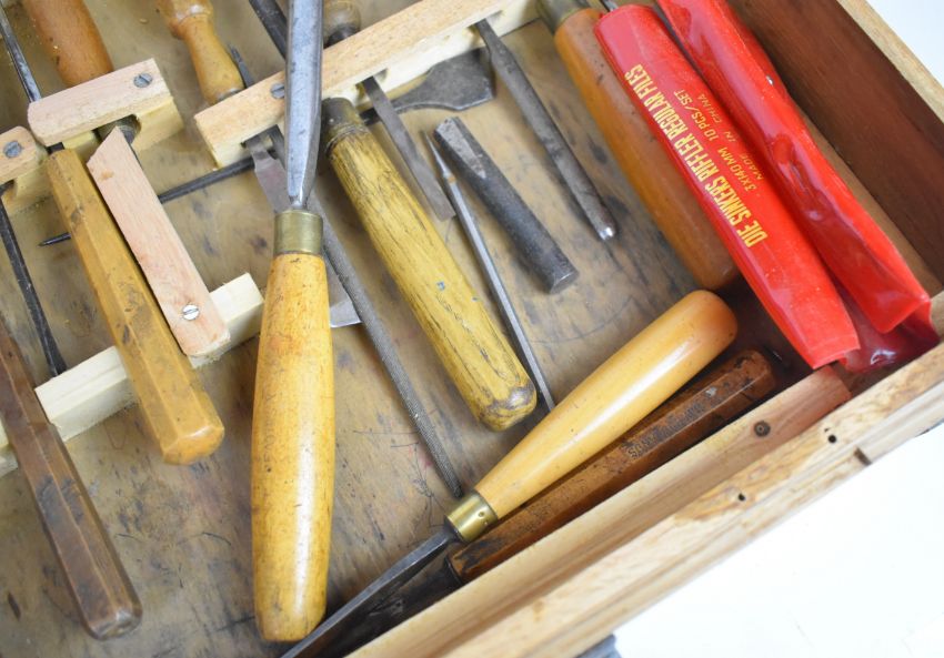 Large collection of wood turning and carving tools in a fitted metal bound box, including Marple and Sons, Addis, Marscen Brothers, etc, W54 x D40 x  H14cm