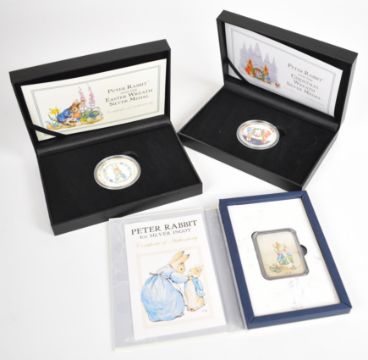 Three Mint Editions Peter Rabbit silver items comprising two medals and an ingot, weight of all three 91g, all with limited edition certificates in original boxes