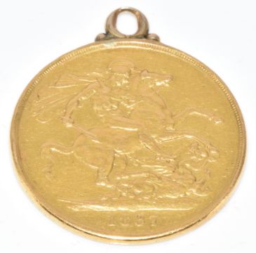 Queen Victoria 1887 double sovereign pendant with gold loop, 15.3g