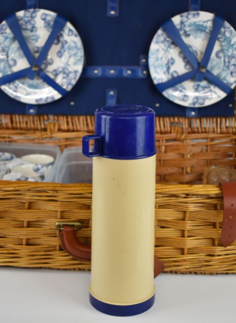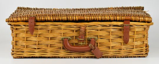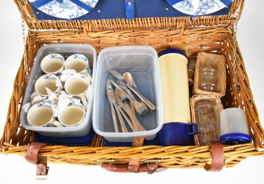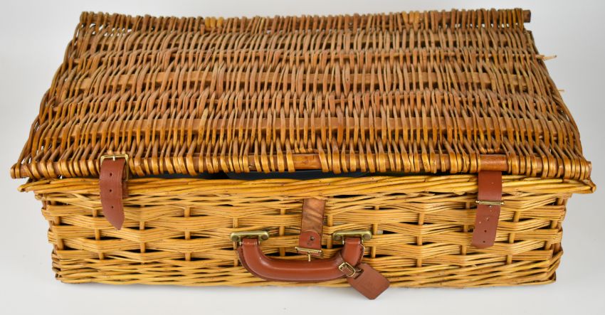 Harrods wicker picnic hamper and contents with embossed 'Harrods' leather label, W67 x D43 x H19cm