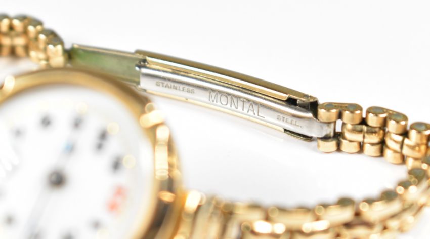 Swiss 9ct gold ladies wristwatch with subsidiary seconds dial, blued hands, black Arabic numerals, gilt minute markers, white dial and 15 jewel movement, on gold plated bracelet, case diameter 25mm.