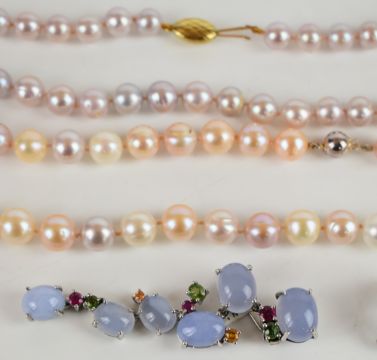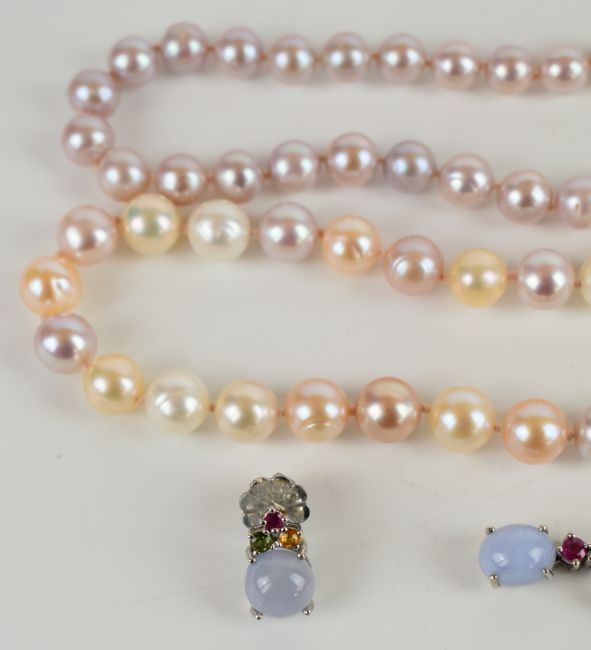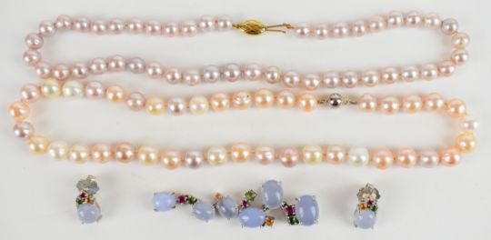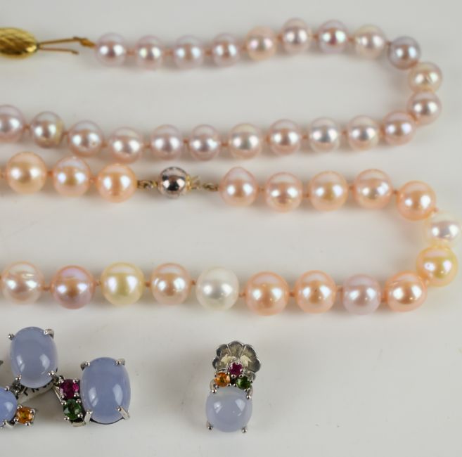 Two strings of cultured pearls, one with a 9k gold clasp and the other a silver clasp, together with a silver brooch and matching earrings set with synthetic rubies, tourmaline, zircon, and blue cabochons