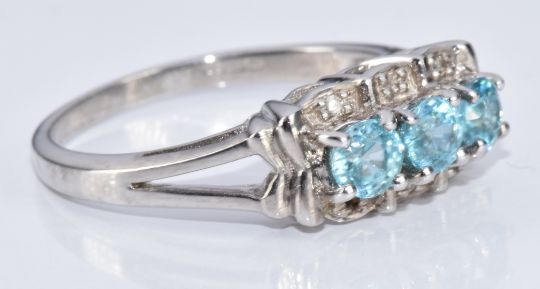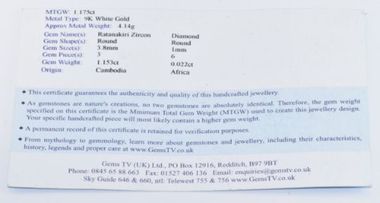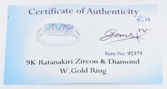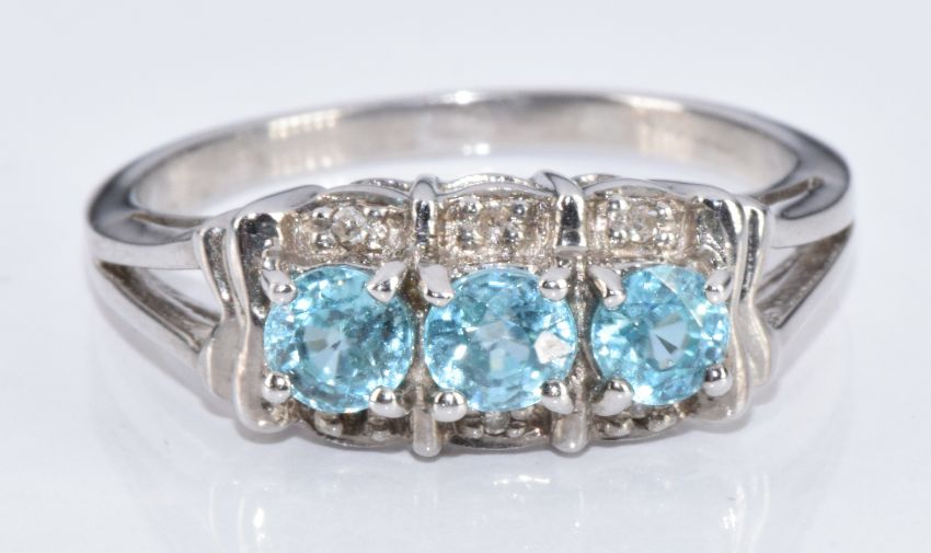 A 9k white gold ring set with three round cut zircon and diamonds, with certificate, 4.2g, size O